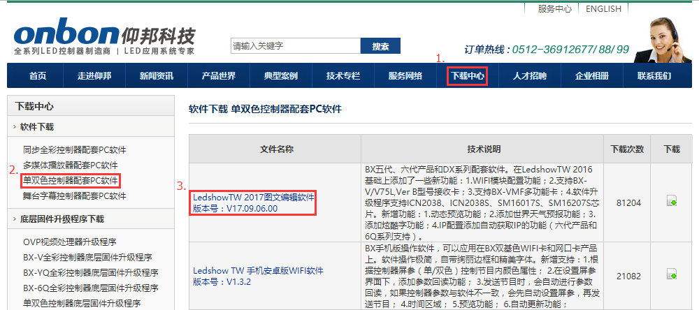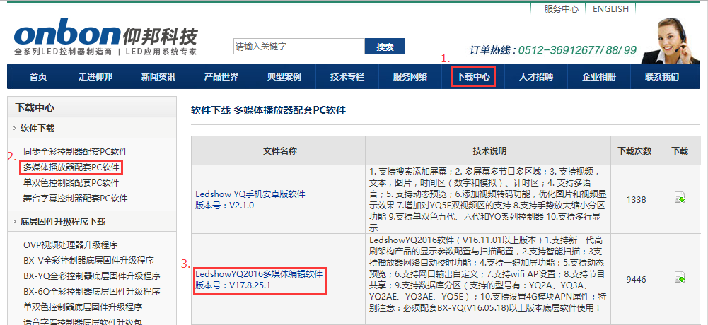 用户需要进入仰邦官网(http://www.onbonbx.com/),在主页上点击“下载中心”。在下载中心页面的左侧导航栏中,找到软件下载模块。根据用户所要用到的控制器型号,选择对应的配套PC软件,使用YQ或Y系列控制器的点击“多媒体播放器配套PC软件”,选择版本号大于18.9.29.1的最新软件,如图 4.1-1所示,使用6代控制器的点击“单双色控制器配套PC软件”,选择版本号大于18.10.19.0的最新软件,如图 4.1-2所示,然后点击下载最新版的配套PC软件。(注:该多媒体软件只能在windows系统下运行)