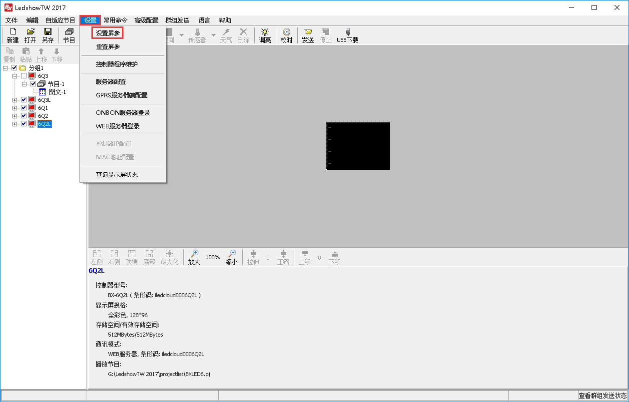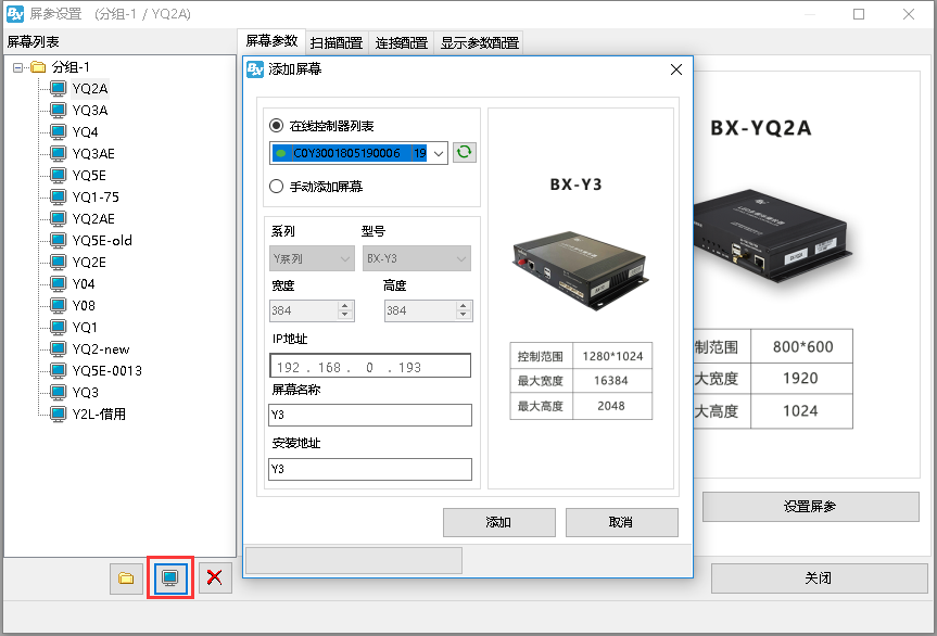1. 打开LedshowYQ多媒体编辑软件(下面简称为YQ软件),点击菜单栏上的“设置”,选择“设置屏参”,点击“添加屏幕”按钮,选择“在线控制器列表”并选择要加入的屏幕,点击“添加”。