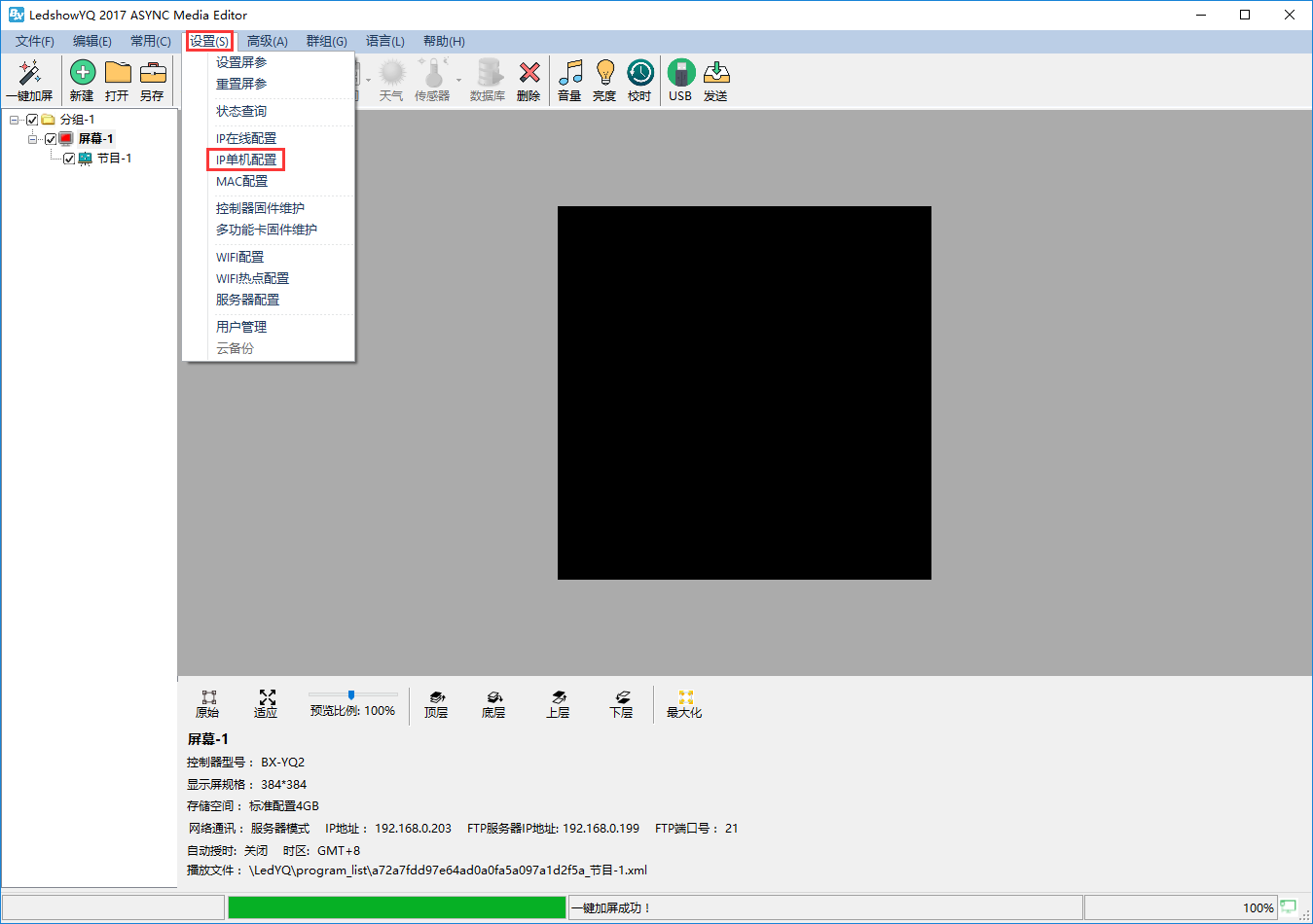 2. 在加屏成功后,如图 4.2-2所示,点击菜单栏上的“设置”,选择“控制器IP配置”,输入密码:888