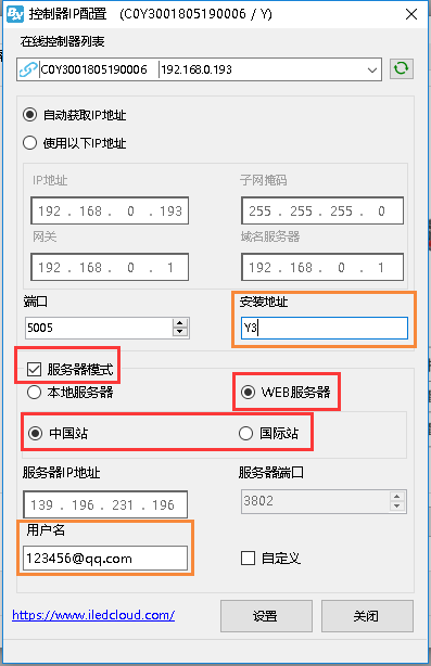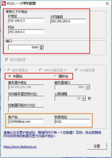 3. 在控制器IP配置界面,用户可修改设备的IP地址(推荐使用“自动获取IP地址”),勾选“服务器配置”,选择“WEB服务器”,中国用户请选择“中国站”,国际用户请选择“国际站”,若用户填写了“用户名”(平台登录时使用的邮箱或手机号)和“安装地址”(可自定义,用标识屏幕),如图 4.2-4所示,然后点“设置”(注:进行IP单机配置时,请确保当前局域网中只接入一台设备),当这张控制器连入网络后,该控制器会自动添加到对应用户的名下,无需用户手动添加屏幕。