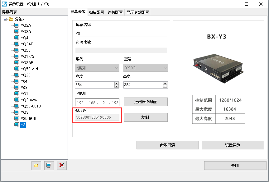 在YQ软件的设置->设置屏参中,用户可获得设备的条形码,如图 4.2-8所示。在控制器的机身上也会贴有条形码的标签。若用户在YQ软件的屏参设置中能同时获得识别码和条形码,则在之后添加屏幕时,优先使用条形码。若用户只能获得识别码,则添加屏幕时输入识别码。